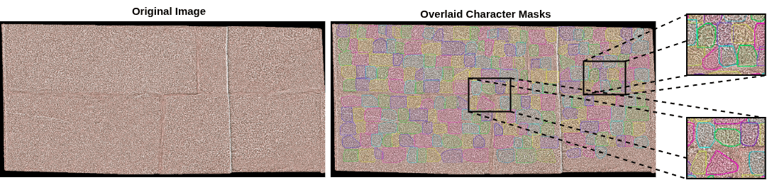 To evaluate our approach, we create a benchmark dataset by annotating precise character-level polygons for historical stone inscriptions in Kannada script (a southern Indian script). We extend the Shilalekhya Inscription Binarization Dataset of heavily degraded Indic stone inscriptions. These inscriptions span diverse historical periods, styles of etching, physical conditions and the background surface is visually indistinguishable from noise. This extension establishes a new benchmark for research in computational epigraphy.